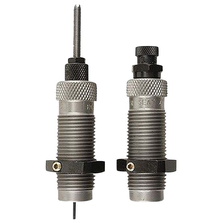 This two-die set is intended for reloading bottleneck cases, and consists of a Full-Length Sizer Die with an Expander-Decapping Unit, and a Seater Die with Bullet Seater Plug. The Full-Length Sizer Die brings the case to SAAMI minimum cartridge dimensions. It sizes the outside of the case, de-primes and expands the neck to accept the bullet. The die has vents to prevent case damage caused by trapped air and for excessive lubricant. Headspace is held to minimum tolerances to avoid changing the case body length during full length sizing. The included Seater Die has a built-in roll crimper to secure the bullet at the same time as it's seated.