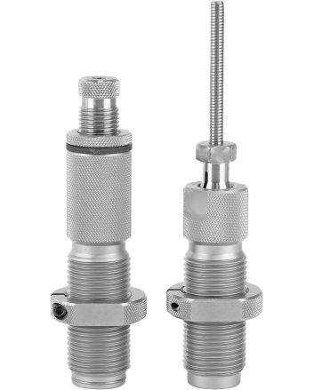 Hornady's Custom-Grade Dies provide a lifetime of reloading. They are so well-crafted that they are guaranteed never to break or wear out from normal use. The Sip Spindle design features a series of light threads cut on the spindle and spindle collet. This design eliminates slippage and takes the knuckle-busting out of tightening the spindle lock while making spindle adjustments a snap. Series I features the popular bottleneck rifle cartridges. This two-die set includes a sizing die and bullet seater die.
