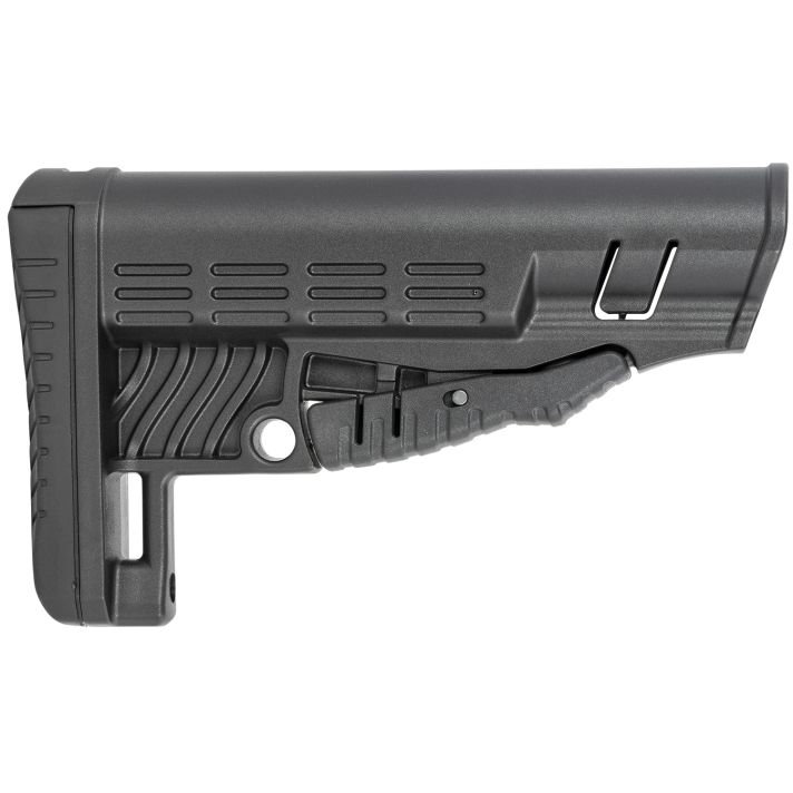Stylish collapsible buttstock for COMMERCIAL SPEC buffer tubes. Sleek design with metal QD base on each side for QD slings. Integrated rubber butt pad for non-slip secure shouldering, comfort, and recoil mitigation. Unique latch mechanism, first click for adjusting stock position and a second full click for mounting/demounting from the buffer tube.